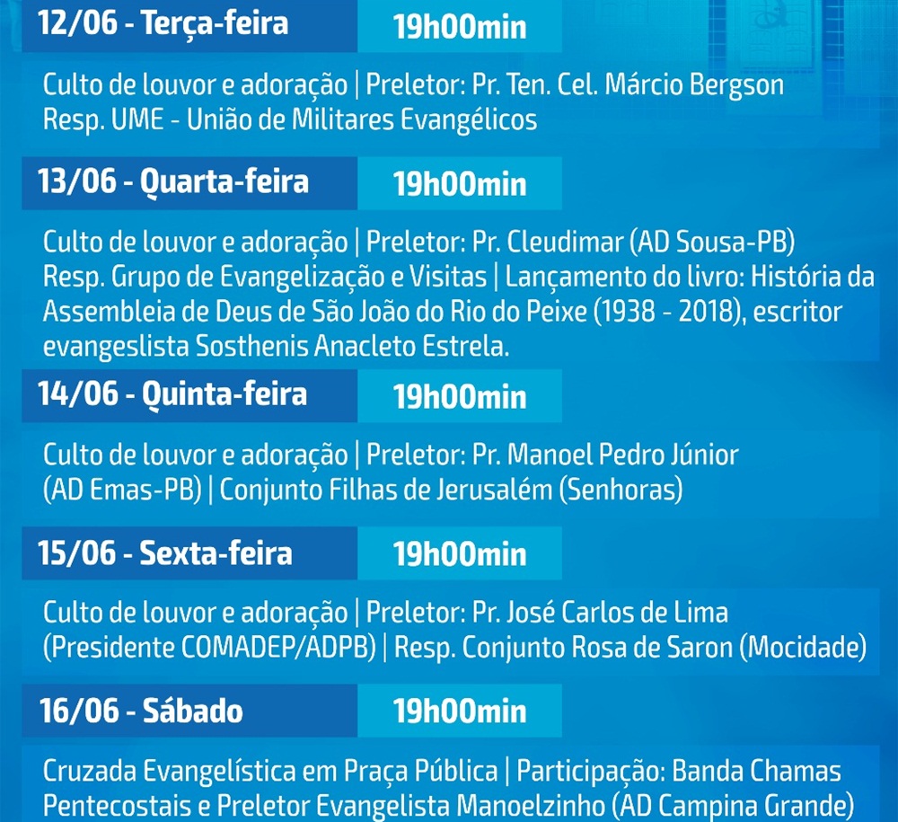Dentro das festividades, no dia 13 de junho, será lançado o livro: História da Assembleia de Deus em São João do Rio do Peixe de autoria do escritor evangelista Sosthenis Anacleto Estrela.