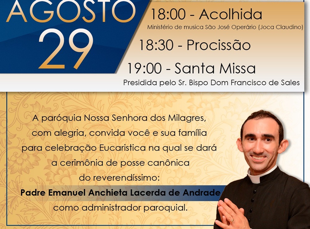 A solenidade de posse canônica terá início às 18hs, com a acolhida na cidade, em seguida procissão e a partir das 19hs celebração da missa.
