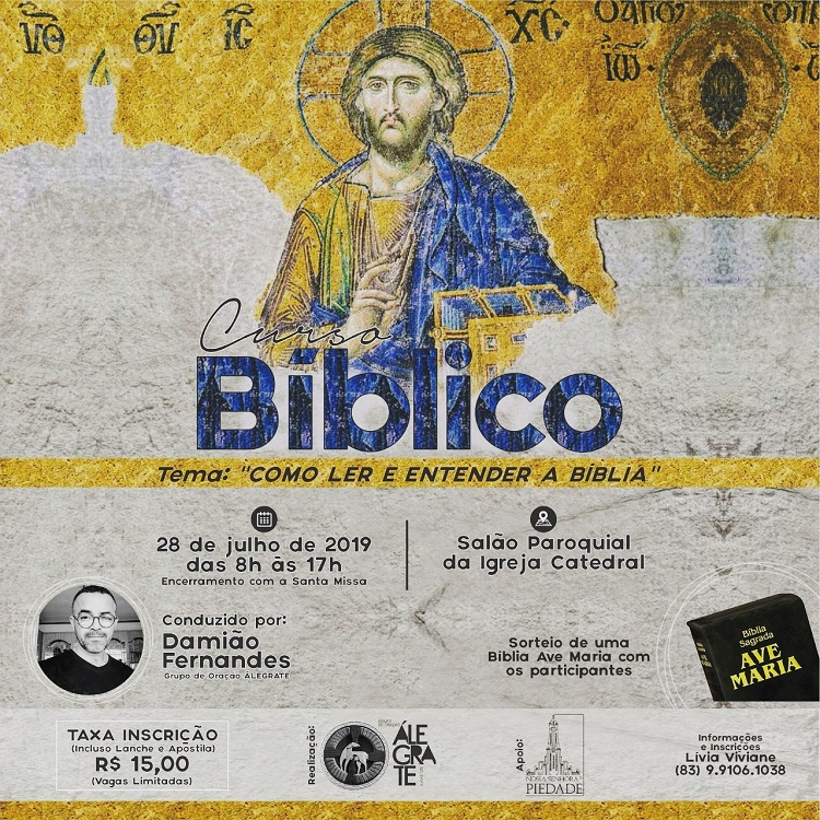 O grupo de oração ‘Álegra-te’, estará realizando no dia 28 de Julho, das 8h às 17h no Salão Paroquial da Catedral, o Curso Bíblico: “Como ler e entender a Bíblia”.