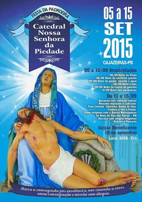 O outro evento é a programação da Festa da Padroeira do município, que inicia suas atividades no sábado (05), estendendo-se até o dia 19 de setembro, quando acontece o Jantar da Amizade na AABB de Cajazeiras, tendo a Paróquia da Nossa Senhora da Piedade, Catedral, como idealizadora.