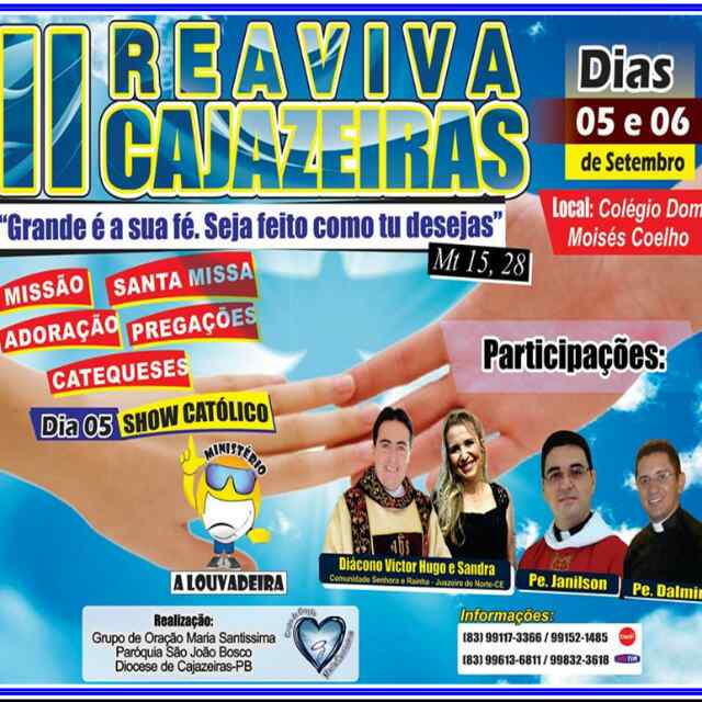 No final de semana, dia 05 e 06, aconteceu no Colégio Dom Moisés Coelho o II Reaviva Cajazeiras, promovido pelo Grupo de Oração Maria Santíssima da Paróquia de São João Bosco. O primeiro Reaviva aconteceu nos dias 16 e 17 de agosto de 2014.