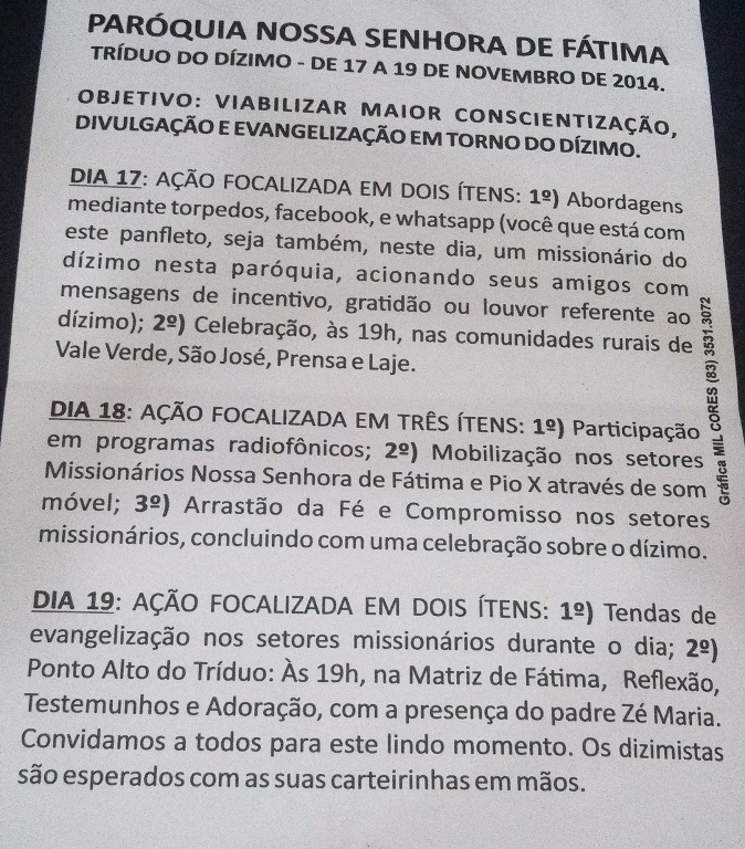 A Pastoral do Dízimo da Paróquia Nossa Senhora de Fátima de Cajazeiras está realizando o Tríduo do Dízimo dos dias 17 a 19 de novembro deste ano.