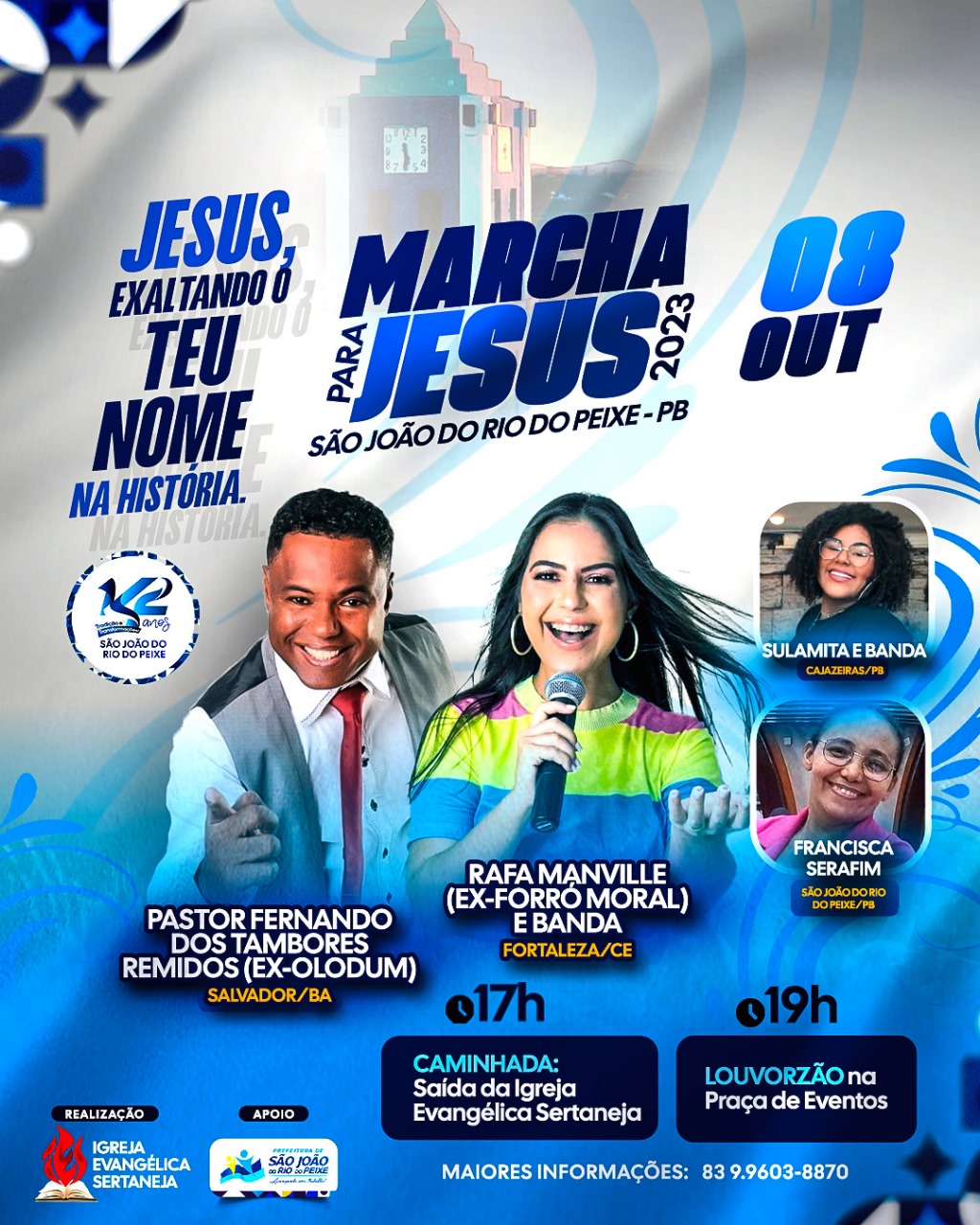 A Igreja Evangélica Sertaneja vai realizar, no próximo domingo (8), a 15ª Marcha para Jesus da cidade de São João do Rio do Peixe, no Alto Sertão paraibano, com quatro atrações musicais, entre elas Fernando dos Tambores Remidos (ex-Olodum).