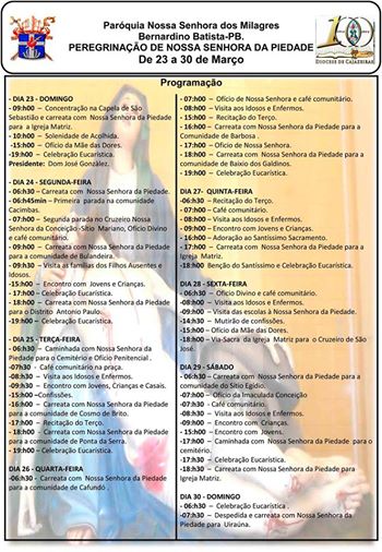 Ainda no domingo (23), haverá a solenidade de acolhida Às 10:00 horas.Às 15:00 horas ocorrerá o ofício de “Mãe das Dores”, e as 19:00 a celebração da santa missa, presidida pelo Bispo Dom José Gonzalez