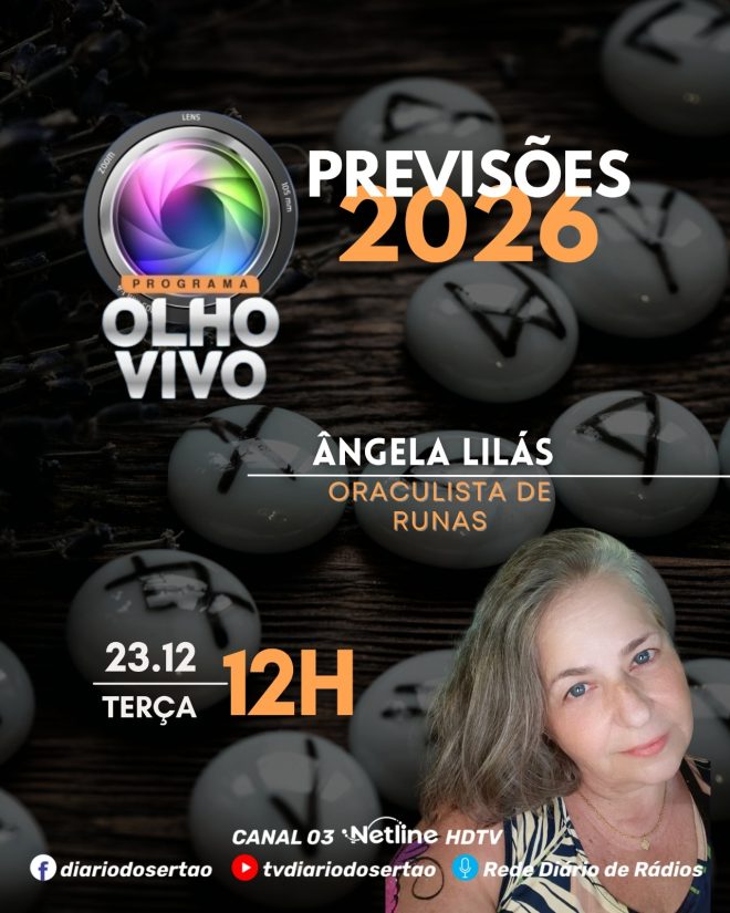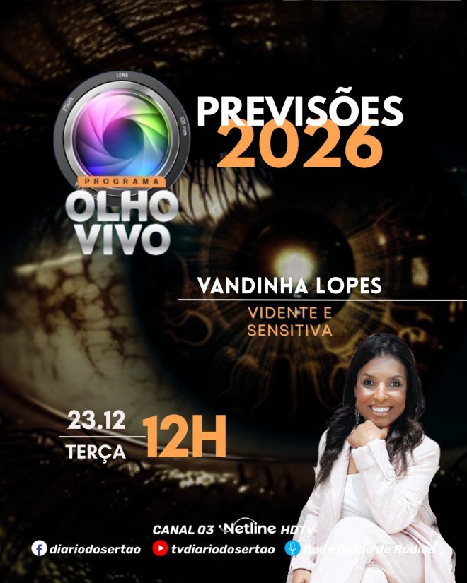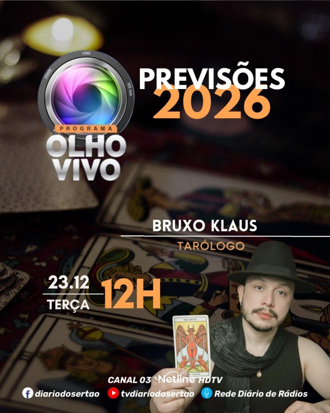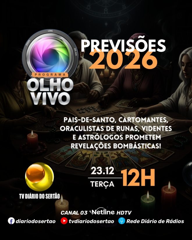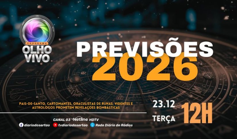 O ano de 2026 se aproxima e, segundo diversos místicos, promete reviravoltas inimagináveis. No dia 23 de dezembro, ao meio-dia, o programa Olho Vivo – Previsões 2026, exibido pela TV Diário do Sertão e pela rede de rádios do Sistema Diário de Comunicação, reunirá um time de peso para decifrar o que o ciclo que se inicia reserva para Cajazeiras, a Paraíba, o Brasil e o mundo.