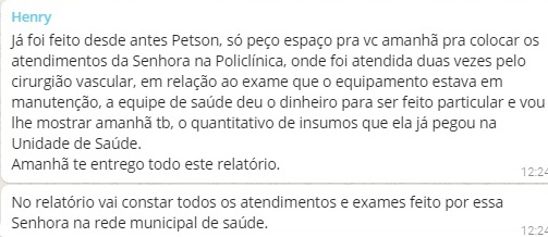 Nesta quarta-feira (29), o secretário usou a rede social Whatsapp para explicar que a idosa já passou por vários procedimentos, inclusive exames pagos pelo município.