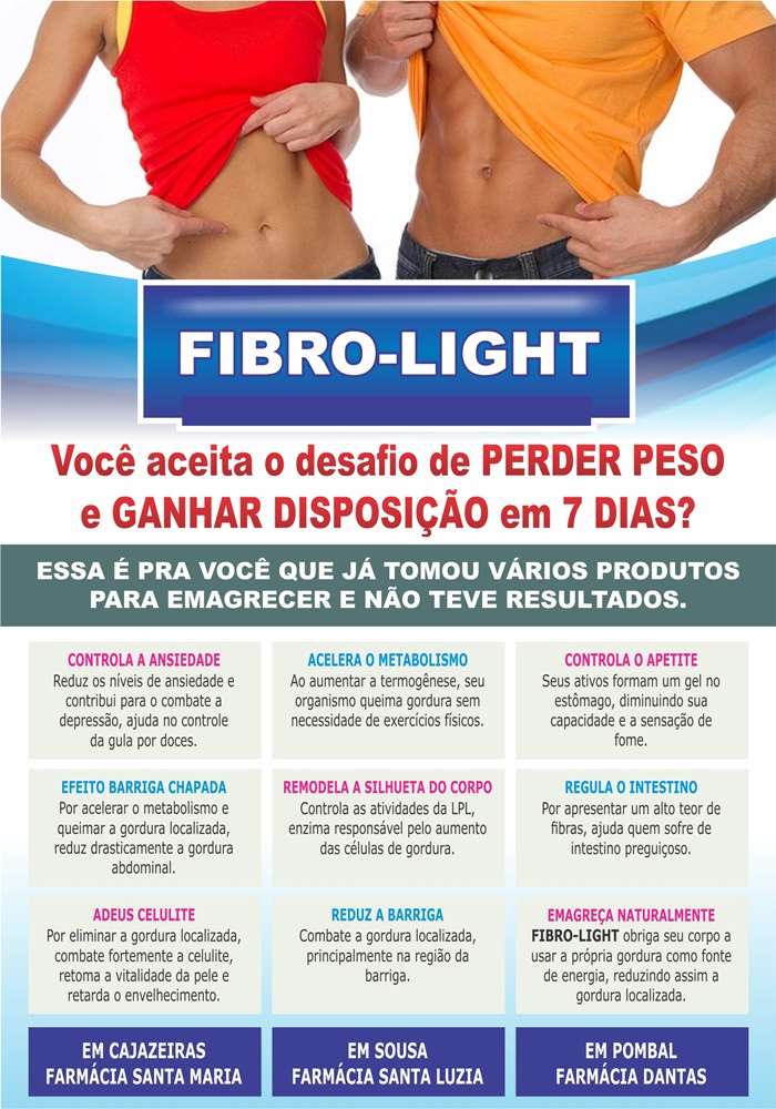 Um novo produto chegou a Cajazeiras prometendo perda de peso em apenas 7 dias. Na Farmácia Santa Maria, os clientes já podem encontrar o Fibro-Light, uma composição em comprimido 100% natural que regula o intestino, acelera o metabolismo e, com isso, faz o corpo usar a própria gordura como fonte de energia, reduzindo a gordura localizada.