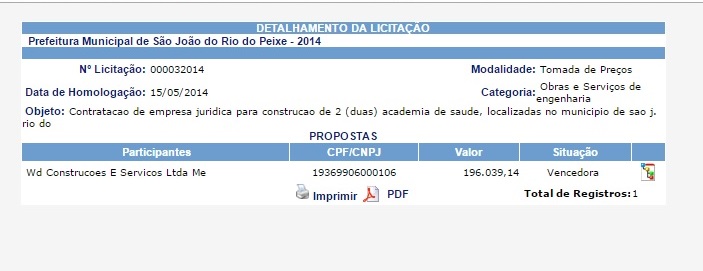 A academia tem recursos do Governo Federal, através do Ministério da Saúde. A prestação de contas da prefeitura municipal de São João do Rio do Peixe ao Tribunal de Contas do Estado, consta que a empresa Wd Construções e Serviços Ltda Me, ganhou uma licitação no valor de R$ 196.039,14, para construir duas academias de saúde. A licitação foi homologada em 15/05/2014.