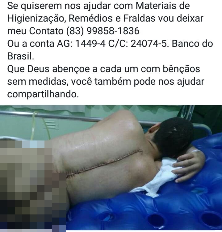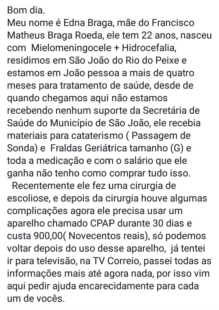 A mãe de Francisco Matheus Braga Roeda, 22 anos, natural de São João do Rio do Peixe iniciou neste mês de novembro uma campanha nas redes sociais pedindo ajuda para o jovem, que está cirurgiado no Hospital Samaritano, em João Pessoa. Há cinco meses eles estão na capital do estado devido o tratamento intenso de Matheus.