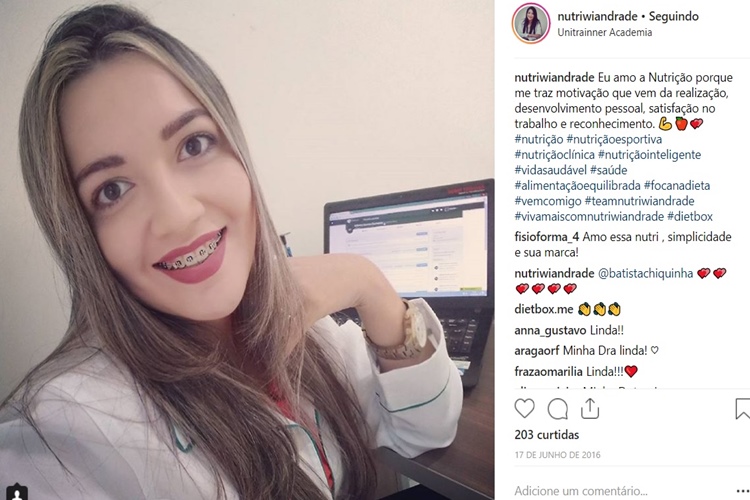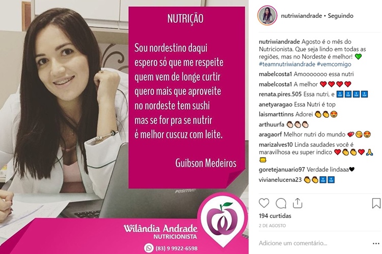 Nas redes sociais, a nutricionista sousense, Wilândia Rodrigues de Andrade, postou um comentário falando do amor e dedicação em exercer seu trabalho na nutrição: