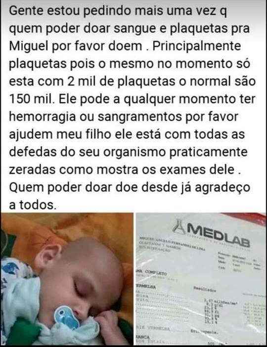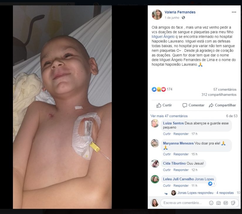 “Olá amigos do face, mais uma vez venho pedir a vocês doações de sangue e plaquetas para meu filho que se encontra internado no hospital Napoleão Laureano. Miguel está com as defesas todas baixas, no hospital não tem sangue nem plaquetas O+ . Desde já agradeço de coração as doações. Quem for doar tem que dizer o nome dele Miguel Ângelo Fernandes de Lima e o nome do hospital Napoleão Laureano”, disse a mãe do menino.