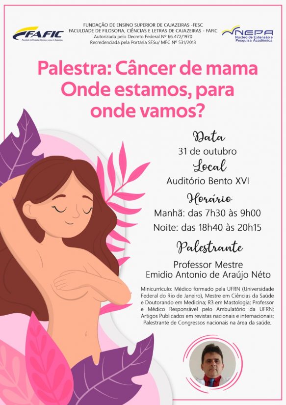 A Faculdade de Filosofia, Ciências e Letras de Cajazeiras (FAFIC) vai promover, nesta quinta-feira (31), uma palestra sobre o câncer de mama com o médico e professor mestre Emídio Antônio de Araújo Neto, que é R3 em Mastologia.