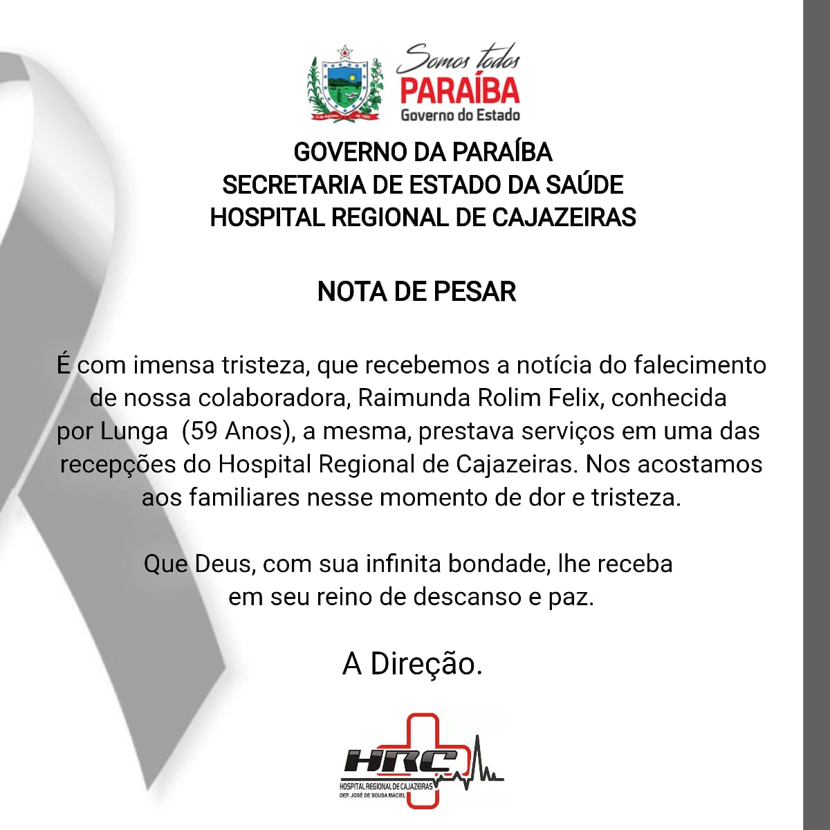 Raimunda Rolim Félix prestava serviço em uma das recepções do Hospital Regional de Cajazeiras. A direção da unidade de saúde emitiu uma nota de pesar pelo falecimento da funcionária.