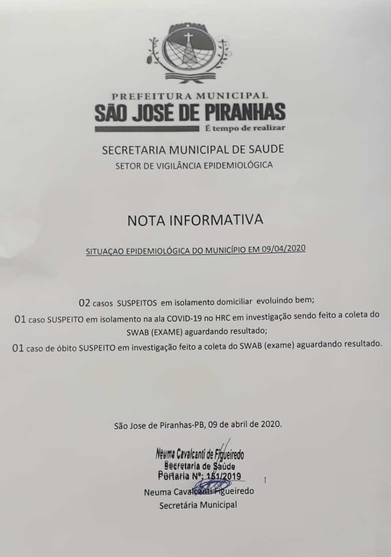 A Secretaria de Saúde do município de São José de Piranhas informou nesta quinta-feira (09), através de uma nota e do boletim epidemiológico, que um óbito está sendo investigado como caso suspeito de Covid-19, doença causada pelo novo coronavírus.