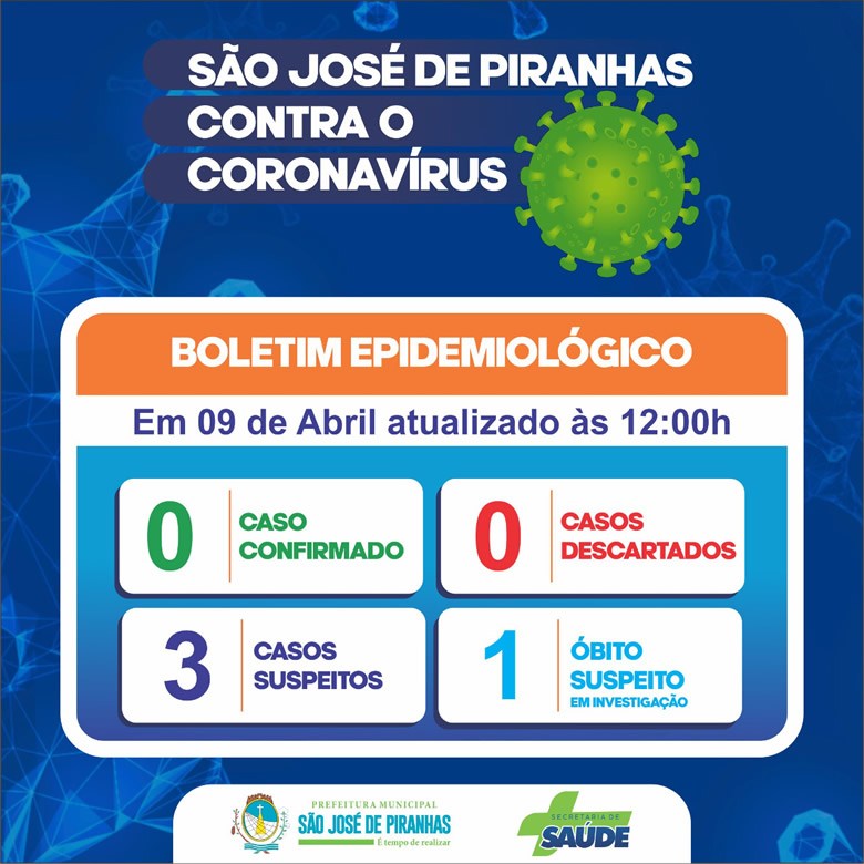 De acordo com o boletim, o município registrou 3 casos suspeitos, nenhum caso confirmado, nenhum caso descartado e 1 óbito suspeito.