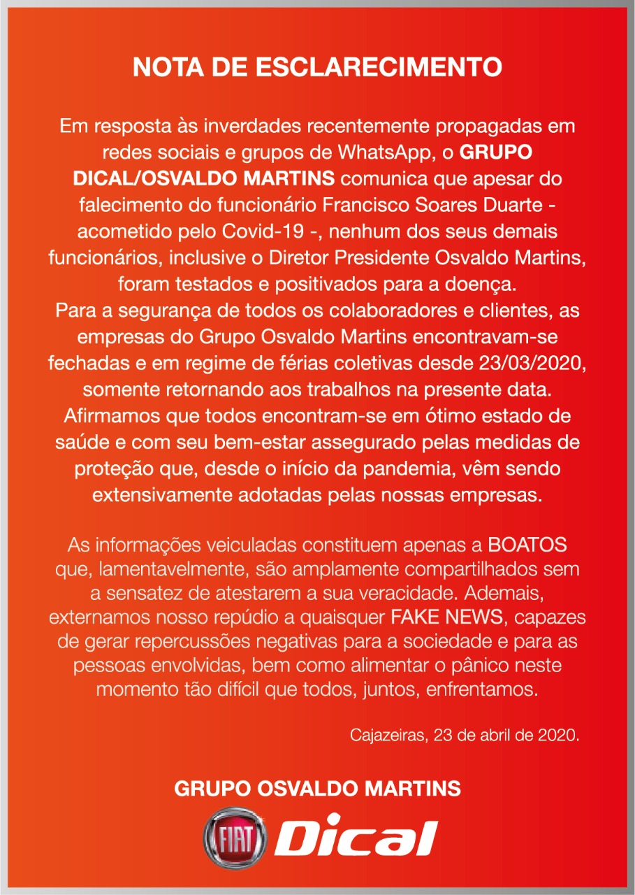 O Grupo Dical emitiu uma nota nesta quinta-feira (23) desmentindo informações que circulam nas redes sociais dando conta de que o empresário Osvaldo Martins também estaria com Covid-19, a exemplo do funcionário Francisco Soares Duarte que faleceu vítima da doença.