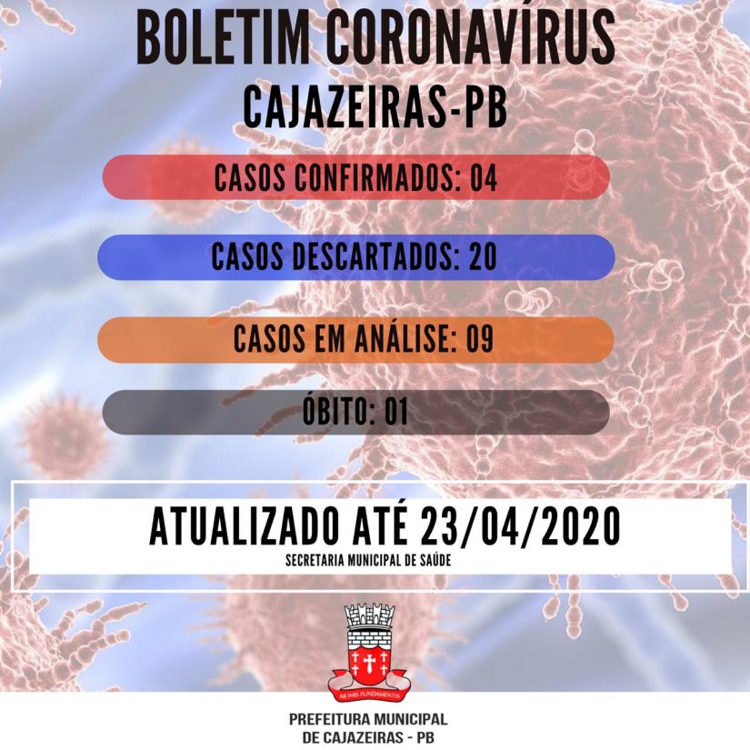 Cajazeiras contabiliza oficialmente 4 casos confirmados, 20 descartados, 9 em análise e 1 óbito.
