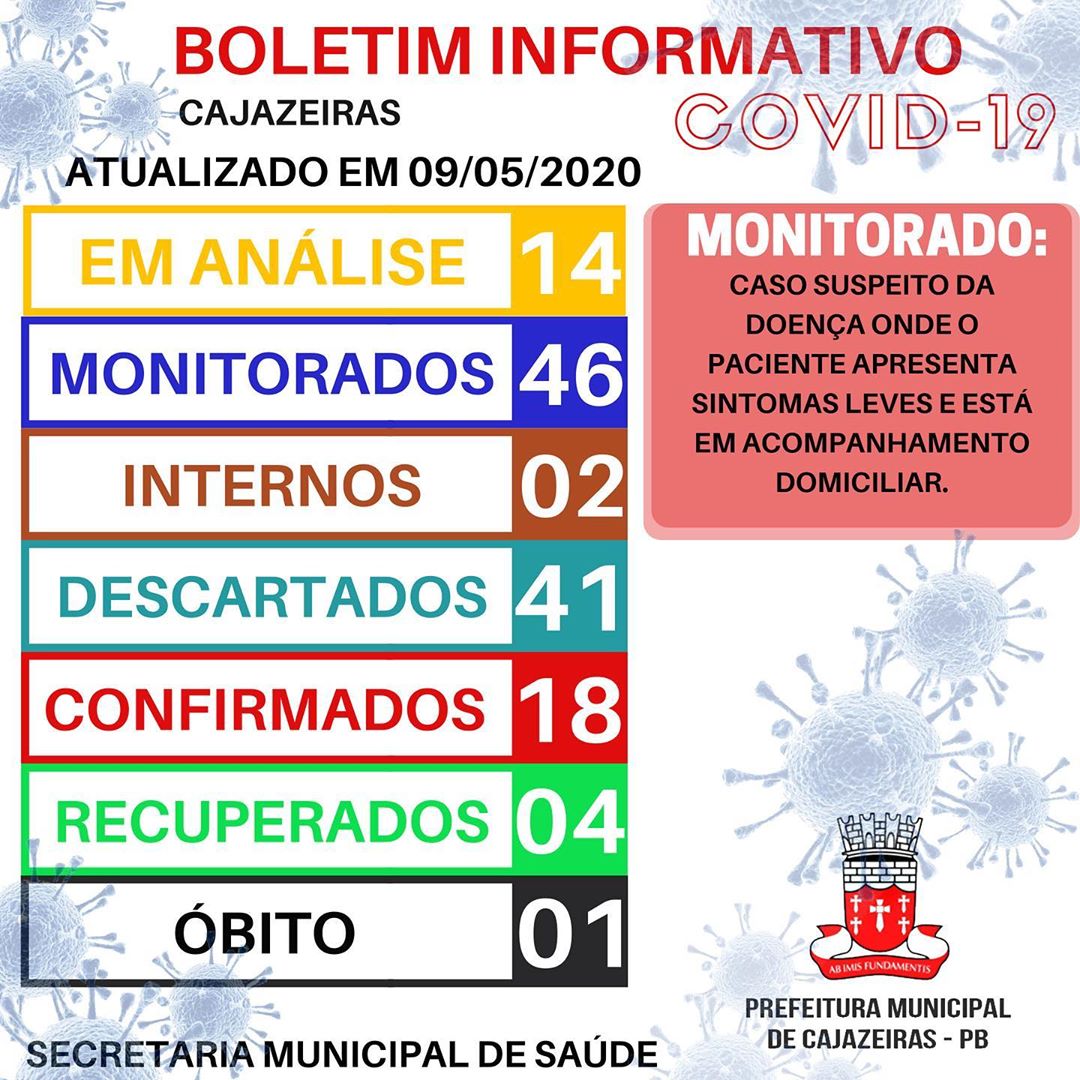 Conforme o boletim, Cajazeiras permanece com 14 casos em análise, 46 monitorados (que tiveram contato com casos confirmados e aguardam o teste), 2 internos, 41 descartados, 18 confirmados, 4 casos recuperados e 1 óbito.