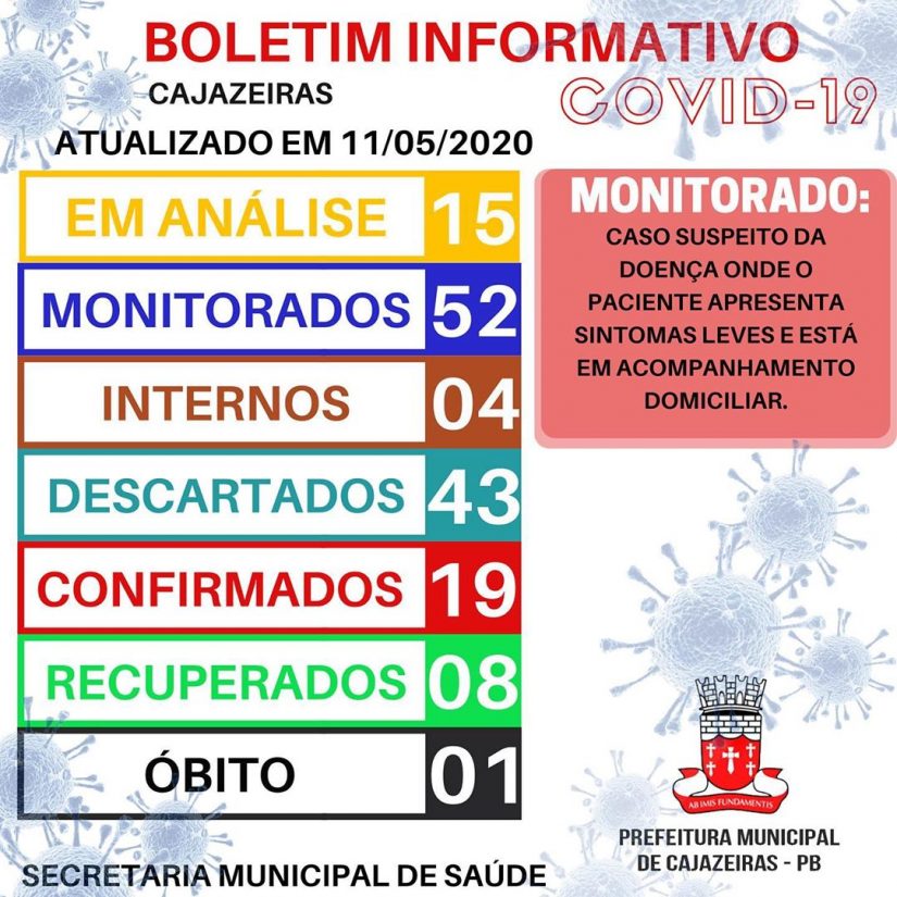 Conforme o boletim desta segunda, Cajazeiras tem agora 15 casos em análise, 52 monitorados (que tiveram contato com casos confirmados e aguardam o teste), 4 internos, 43 descartados, 19 confirmados, 8 casos recuperados e 1 óbito.