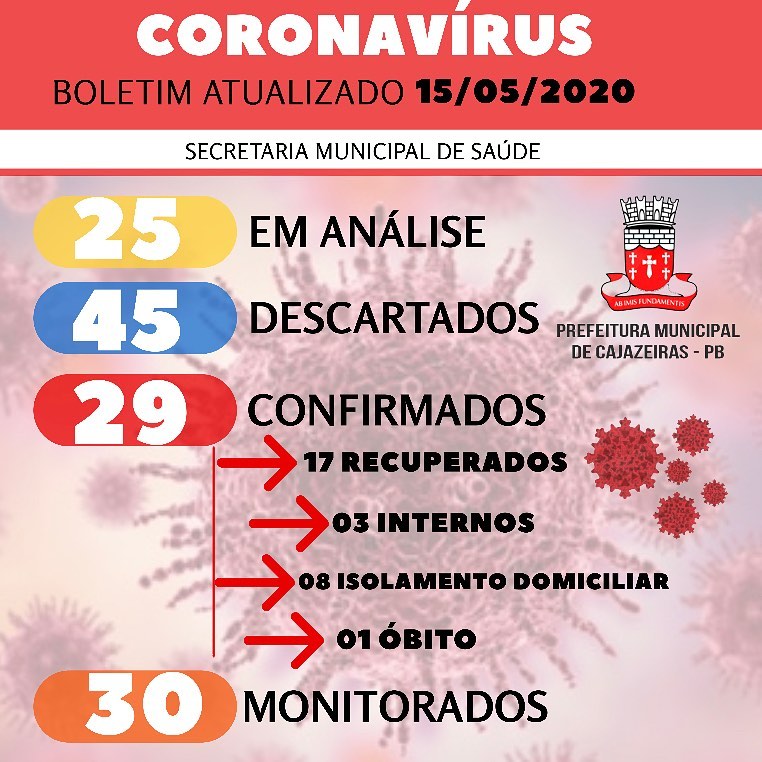 Com esse novo caso, Cajazeiras tem 29 confirmados, 25 casos em análise, 30 casos monitorados (que tiveram contato com casos confirmados e aguardam o teste), 3 casos internos, 45 casos descartados, 17 casos recuperados e 1 óbito.