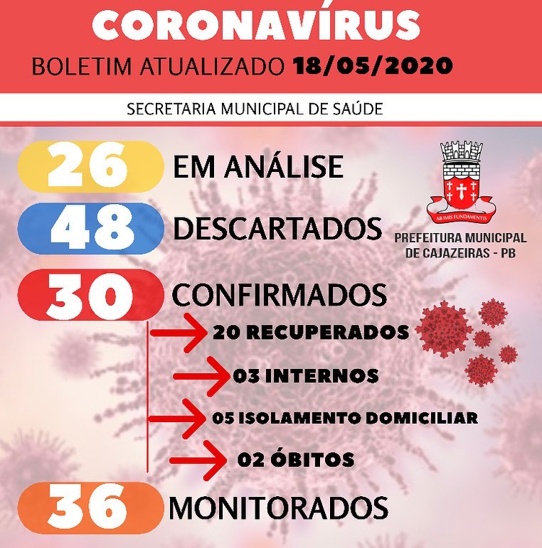 O município segue com 30 casos confirmados registrados até hoje, mas o número de recuperados aumentou para 20. Com isso, 10 pessoas oficialmente contabilizadas estão com Covid-19 em Cajazeiras.