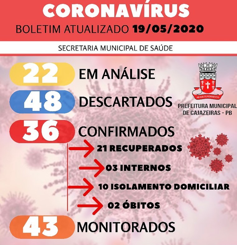 Segundo o boletim desta terça, Cajazeiras tem 22 casos em análise, 48 descartados, 36 confirmados (21 recuperados, 3 internos, 10 em isolamento domiciliar e 2 óbitos) e ainda 35 casos monitorados.