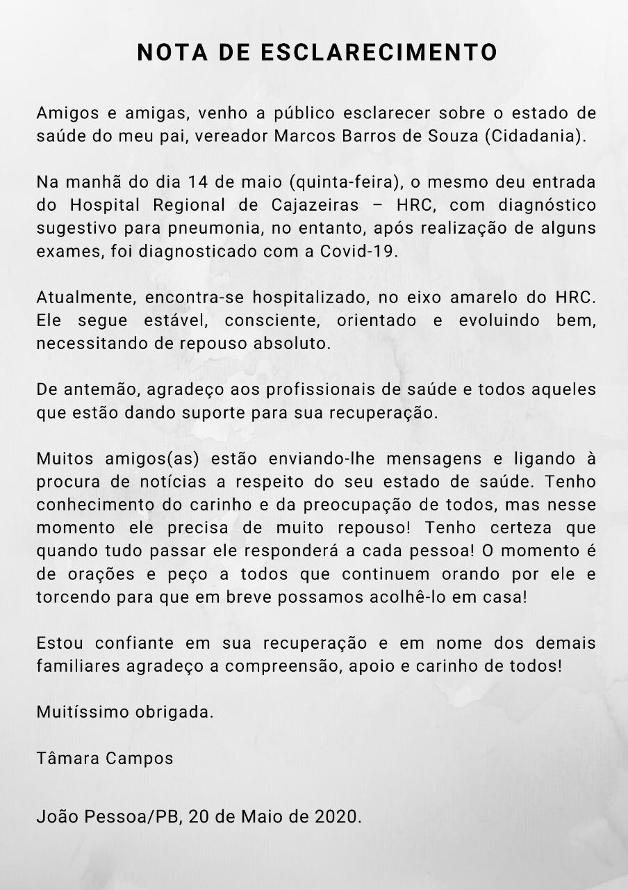 A filha do vereador Marcos Barros, Tâmara Campos, emitiu uma nota de esclarecimento nesta quarta-feira (20) dando detalhes do estado de saúde do pai.