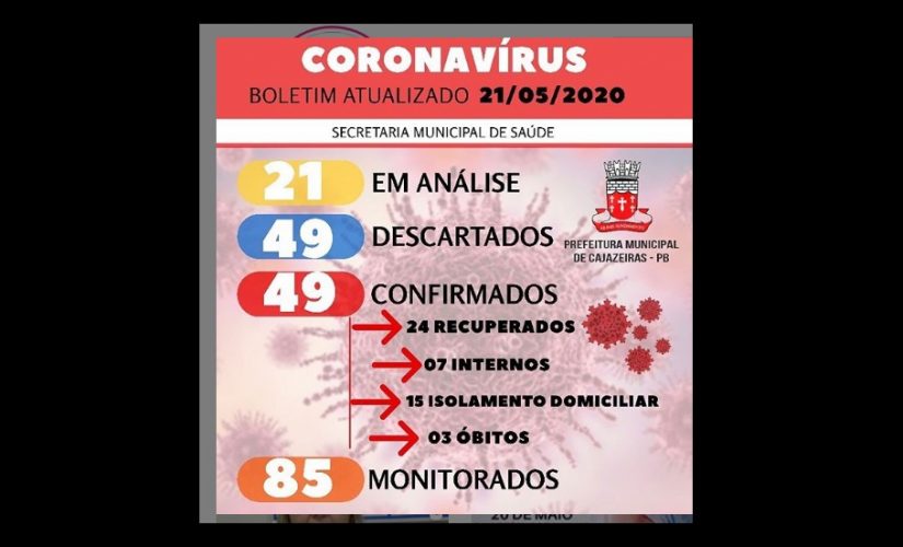 Conforme o boletim de hoje, Cajazeiras tem 21 casos em análise, 49 descartados, 49 confirmados (24 recuperados, 7 internos, 15 em isolamento domiciliar e 3 óbitos) e 85 casos monitorados.