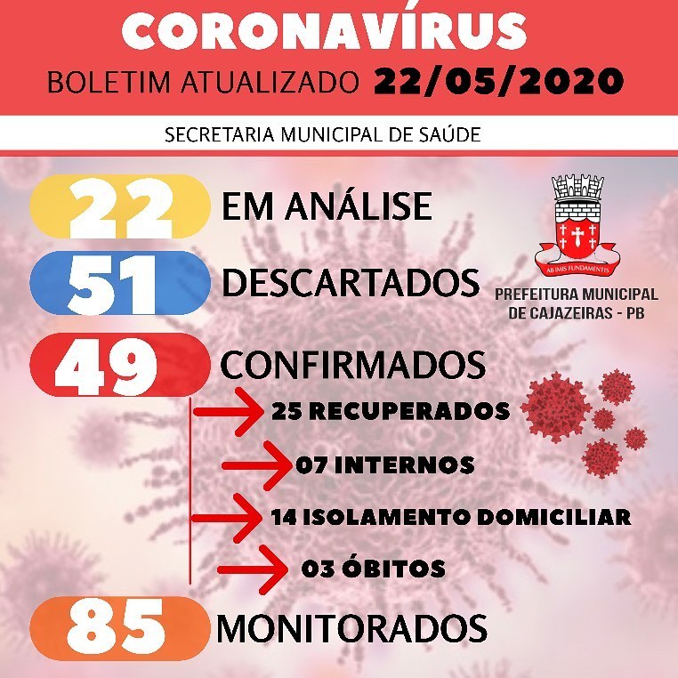 Conforme o boletim, Cajazeiras tem 22 casos em análise, 51 descartados, 49 confirmados (25 recuperados, 7 internos, 14 em isolamento domiciliar, 3 óbitos) e 85 casos monitorados.
