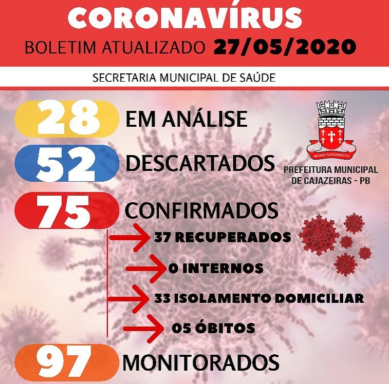 Conforme o boletim de hoje, Cajazeiras tem 28 casos em análise, 52 descartados, 75 confirmados (37 recuperados, 0 internos, 33 em isolamento domiciliar, 5 óbitos) e 97 casos monitorados.