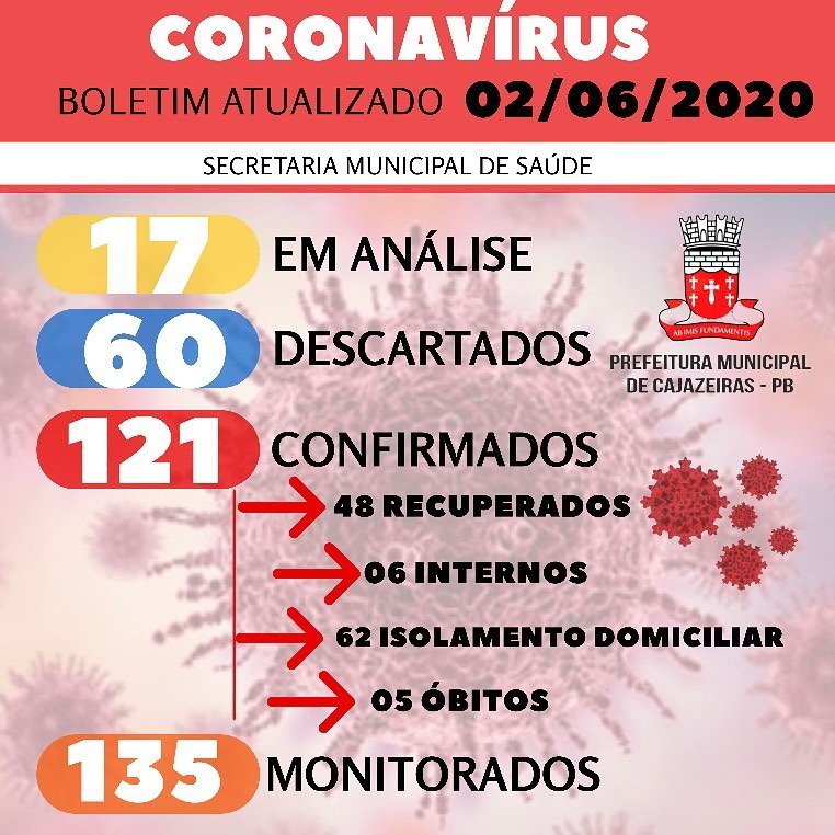 Conforme o boletim de hoje, Cajazeiras tem 17 casos em análise, 60 descartados, 121 confirmados (48 recuperados, 6 internos, 62 em isolamento domiciliar, 5 óbitos) e 135 casos monitorados.