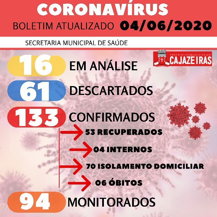 Conforme o boletim epidemiológico, Cajazeiras tem 16 casos em análise, 61 descartados, 133 confirmados (53 recuperados, 4 internos, 70 em isolamento domiciliar, 6 óbitos) e 94 casos monitorados.