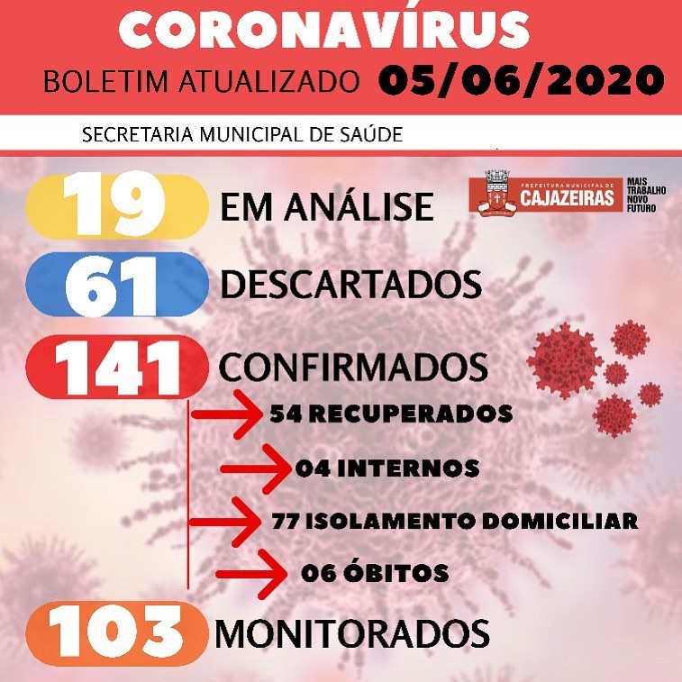 Conforme o boletim epidemiológico, Cajazeiras tem 19 casos em análise, 61 descartados, 141 confirmados (54 recuperados, 4 internos, 77 em isolamento domiciliar, 6 óbitos), 103 monitorados.