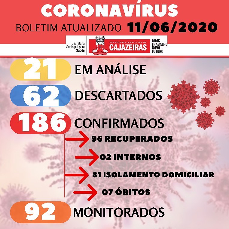 Conforme o boletim de hoje, Cajazeiras tem 21 casos em análise, 62 descartados, 186 confirmados (96 recuperados, 2 internos, 81 em isolamento domiciliar, 7 óbitos) e 92 monitorados.