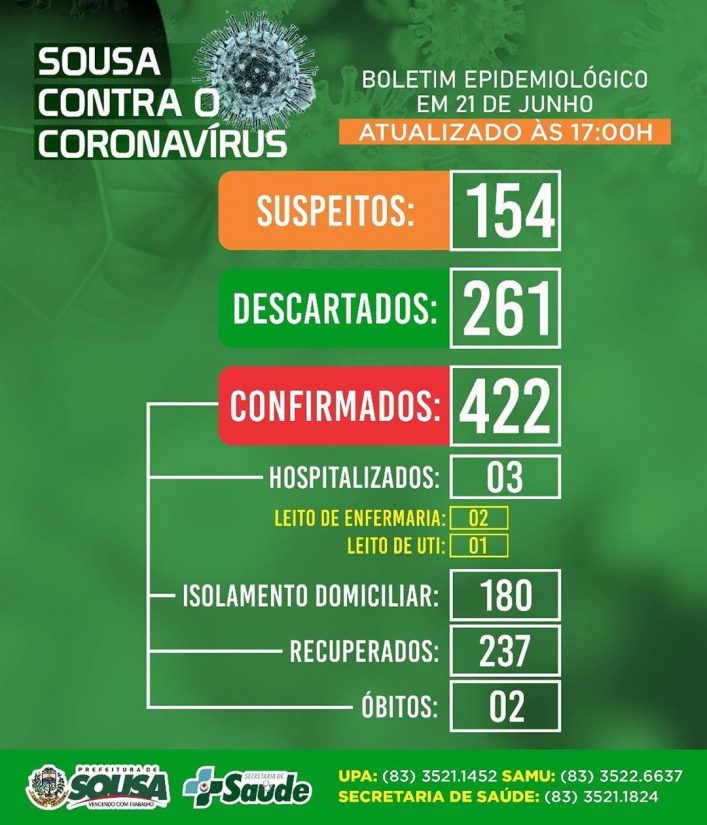 Sousa registrou mais 7 casos confirmados da Covid-19 neste domingo (21). Segundo o boletim divulgado pela Secretaria Municipal de Saúde, agora são 422 casos confirmados, 3 hospitalizados (2 em leitos de enfermaria e 1 em leito de UTI). Outros 180 estão em isolamento domiciliar, 237 recuperados e 2 óbitos. Ainda conforme os dados, os casos suspeitos são 154 e os descarados, 261.