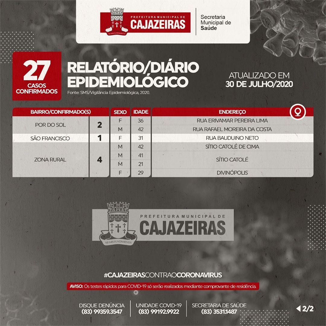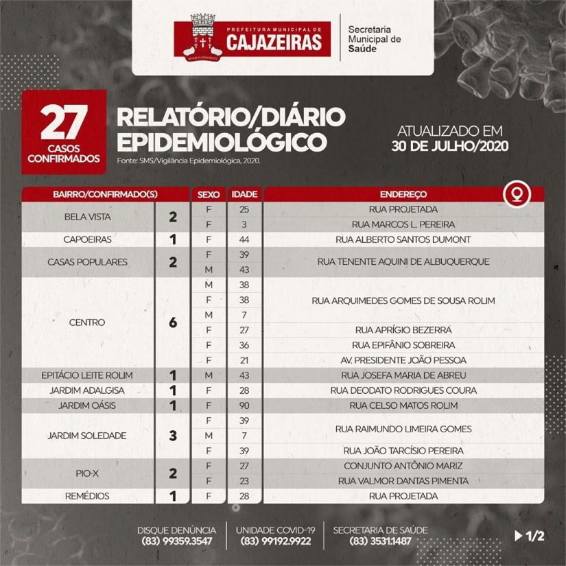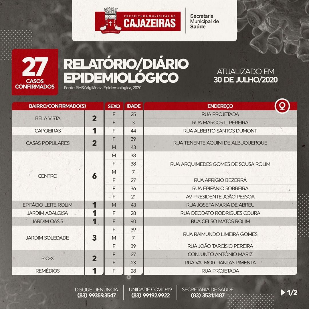 Com esses 27 novos casos, Cajazeiras soma ao todo 1.171 casos de Covid-19 diagnosticados. Por outro lado, 1.012 casos foram recuperados, mantendo o município acima da média nacional de recuperação.