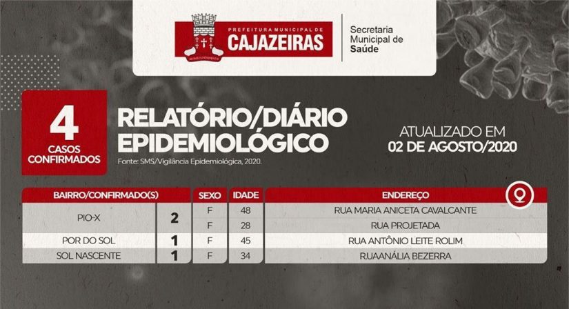 De acordo com o boletim epidemiológico deste domingo, Cajazeiras já contabilizou 1.217 casos de Covid-19, sendo que 1.061 estão recuperados. Portanto, são 156 casos confirmados ativos no município neste momento.