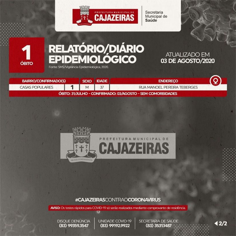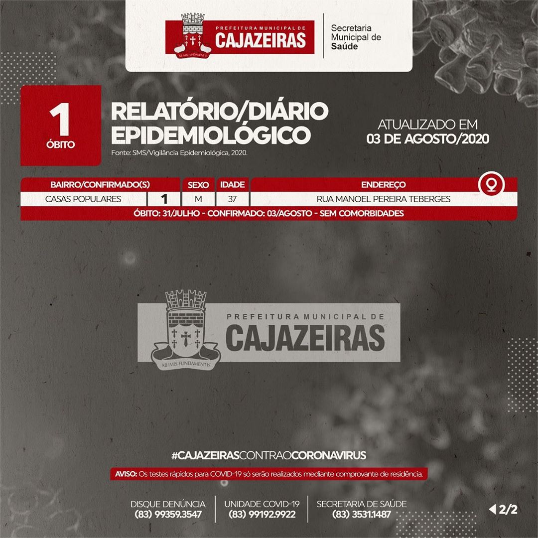 A confirmação oficial do teste por parte do município saiu no boletim da Secretaria Municipal de Saúde desta segunda-feira (3). A vítima não possuía comorbidades. Com a confirmação, este se torna o 33º óbito por Covid-19 registrado pelo município.