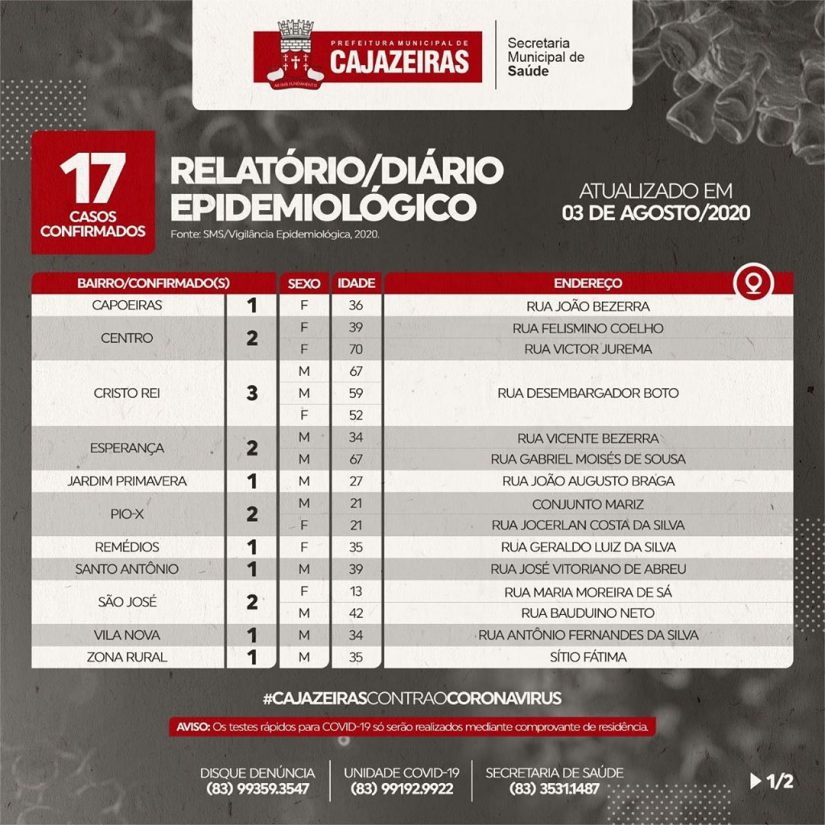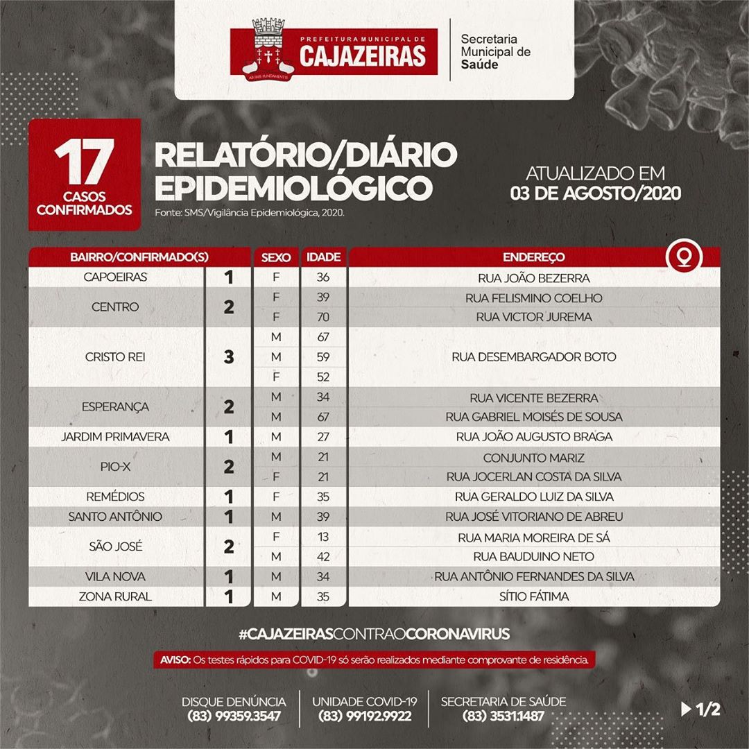 De acordo com o boletim desta segunda, Cajazeiras registrou mais 17 casos confirmados de Covid-19. Agora, o município contabiliza ao todo 1.234 casos. Destes, 1.075 estão recuperados.