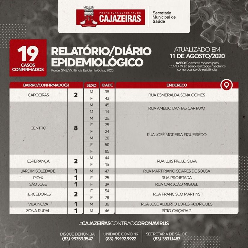 A Secretaria de Saúde de Cajazeiras registrou mais 19 casos confirmados de Covid-19 nesta terça-feira (11), de acordo com o boletim epidemiológico do dia.