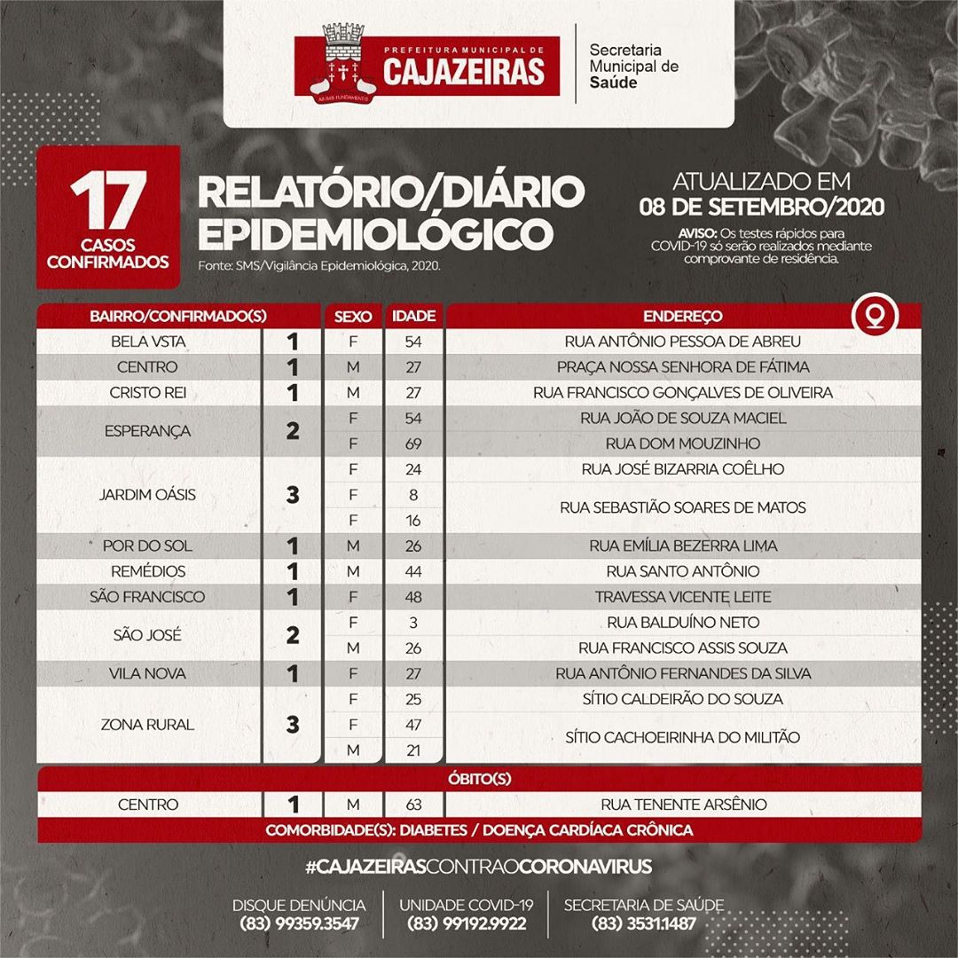 De acordo com o boletim, Cajazeiras tem 43 casos em análise; 83 casos monitorados; 1.693 casos confirmados até agora, sendo que 1.607 se recuperaram, 42 estão em isolamento domiciliar, 1 está internado e 43 faleceram.