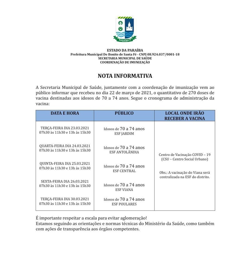 A Prefeitura Municipal de Bonito de Santa Fé, através da Secretaria de Saúde, emitiu nota informativa sobre as datas, horários e locais da vacinação para os idosos de 70 a 74 anos.