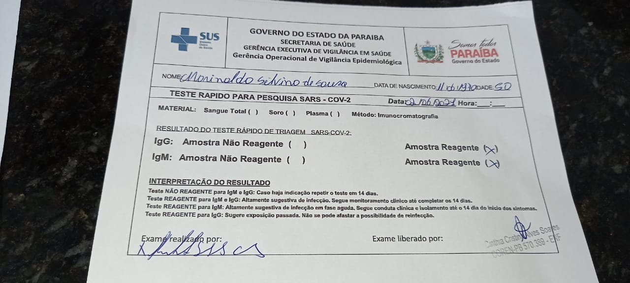Após ter se deslocado para outra cidade para realizar o teste, Marinaldo recebeu o comunicado da Secretaria do município de Itaporanga falando que poderia fazer o exame no mesmo dia. Ele conta que apesar da demora, foi bem atendido pela equipe médica. O agricultor recebeu o resultado positivo dias depois.