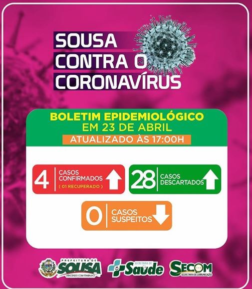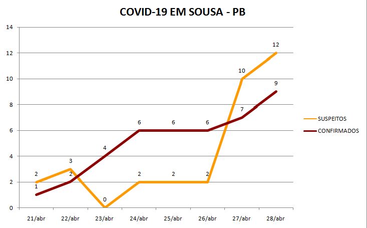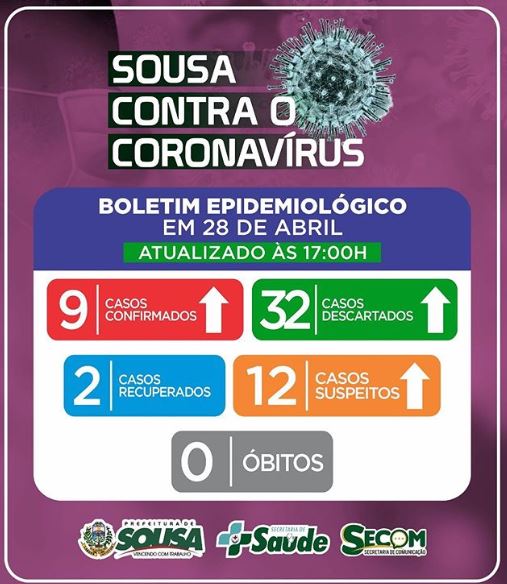 A cidade de Sousa registrou um aumento de 800% nos casos confirmados por coronavírus em uma semana. O aumento ocorreu entre os dias 21 e 28 de abril e foi divulgado nesta terça-feira (28), em boletim epidemiológico da Prefeitura de Sousa. O município sertanejo tem uma média de um caso por dia.
