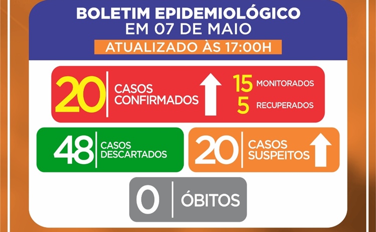 Entre os 20 casos confirmados, 15 permanecem sendo monitorados e 05 já estão recuperados. Já os casos descartados atualmente são 48.