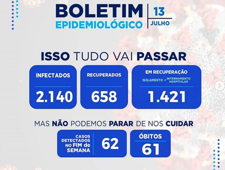 Das 53 localidades inseridas no Boletim, 36 delas não registraram nenhum caso de Covid-19 neste fim de semana. Todos os dados veiculados tanto no Boletim quanto no Relatório, são fornecidos pela Vigilância Epidemiológica do Município.
