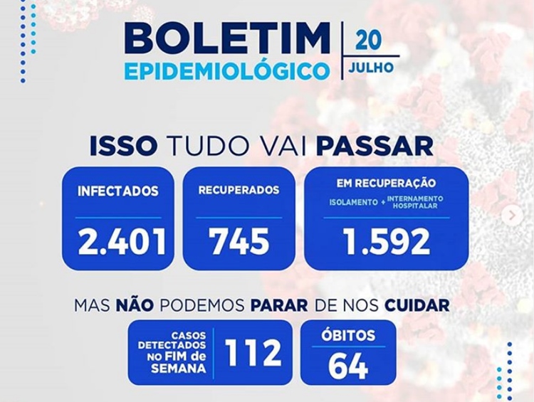 No levantamento feito dos leitos hospitalares nesta segunda, dos 52 disponíveis 22 estão ocupados, enquanto que 1.570 dos infectados cumprem recuperação em isolamento domiciliar. Dos casos registrados por gênero, o sexo feminino está na frente com 1.234 casos, e na faixa etária até 40 anos foram registrados 1.193 casos.