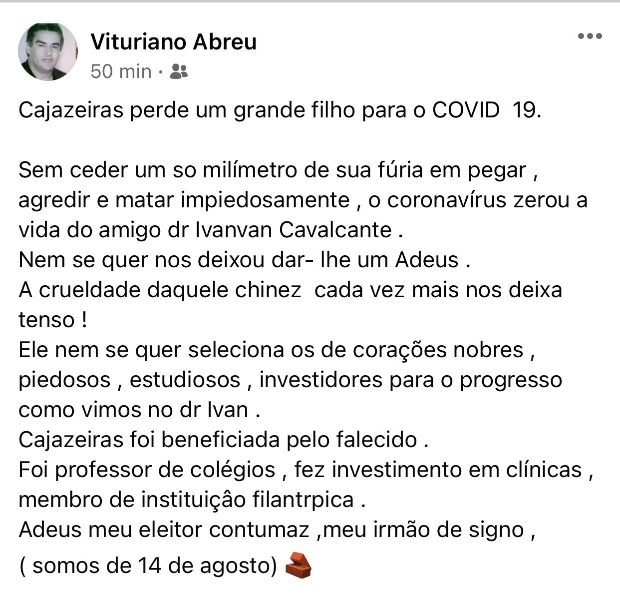 - O médico, ex-prefeito e ex-deputado Antônio Vituriano de Abreu lamentou a morte de Dr. Ivan pela Covid-19.