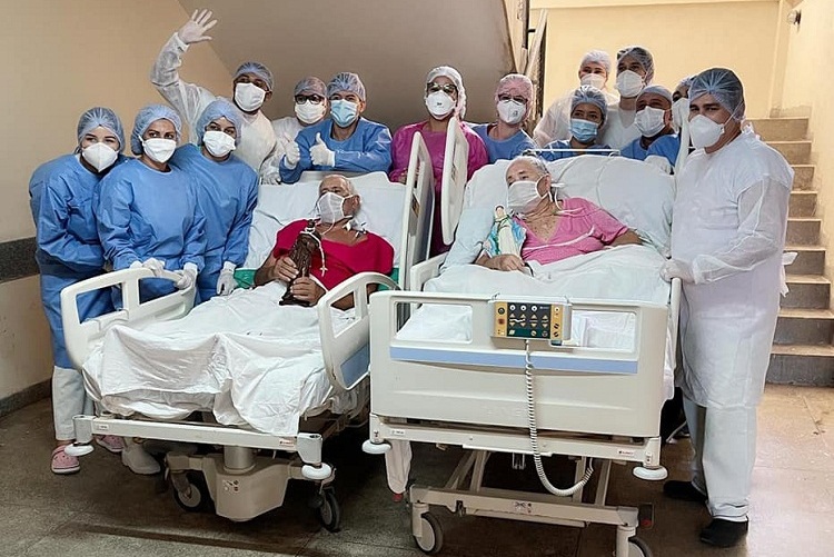 Profissionais de saúde do HRC comemoraram a transferência de seu José Roberto e dona Izaura da Ala Covid-19 para a enfermaria. (Foto: Divulgação).