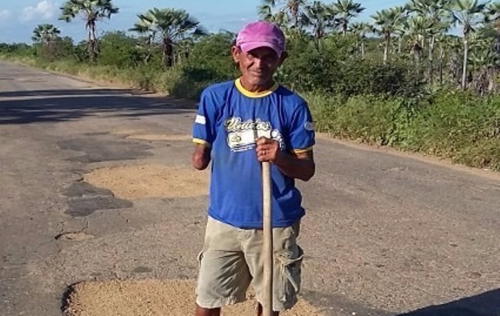 agricultor Cicero Maciel de Sousa vem usando a PB 393, que liga as cidades de Cajazeiras e São João do Rio do Peixe para ganhar um dinheirinho e ajudar nas despesas domésticas. Ele está diariamente na rodovia fazendo a operação ‘Tapa Buraco’.